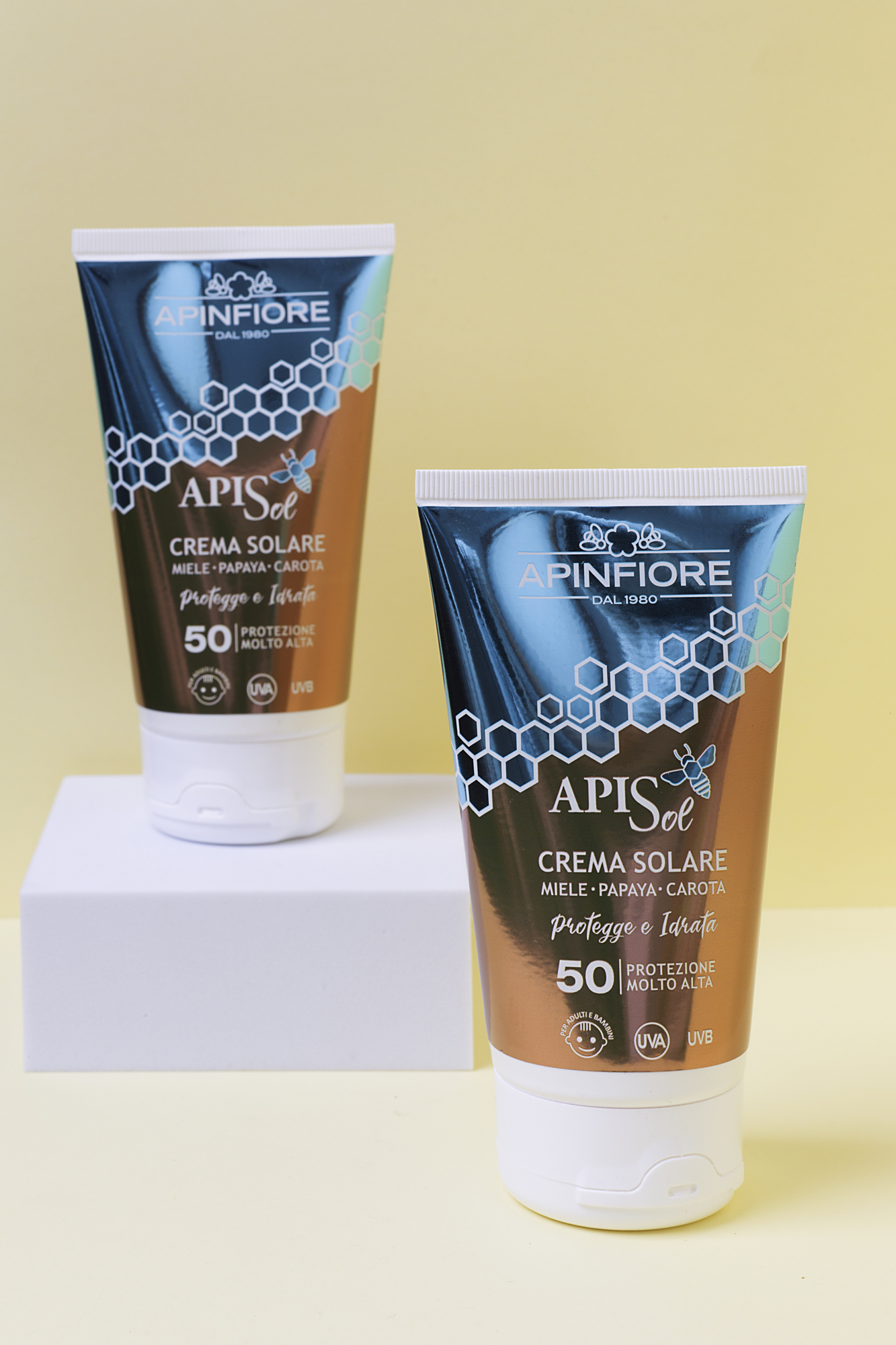 APISOL CREMA SOLARE 50 protezione alta, protegge e idrata il viso e il corpo, adatta a tutti i tipi di pelle, ideale per tutta la famiglia, adulti e bambini (al disopra dei 3 anni), con fattore di protezione solare alto SPF 50. I FILTRI SOLARI proteggono la pelle dai raggi UVA e UVB e garantiscono un’abbronzatura sicura duratura e uniforme, evitando eritemi e scottature. Le preziose sostanze funzionali contenute aiutano a difendere la pelle da vari fattori. In particolare la PAPAYA, ricchissima di vitamina C e provitamina A, protegge la pelle dall’invecchiamento cutaneo. Il MIELE, ricco di antiossidanti, vitamine C, B2, B6, sali minerali e oligoelementi, idrata e nutre la pelle in profondità, mantenendola sana grazie alle sue proprietà lenitive e decongestionanti. La CAROTA, notevole fonte di minerali: ferro, calcio, magnesio, rame, zinco, ricca di beta-carotene, stimola l’abbronzatura ed ha proprietà idratanti, protettive, rivitalizzanti e consente alla pelle di rimanere giovane ed elastica, evitando secchezza e irritazione.